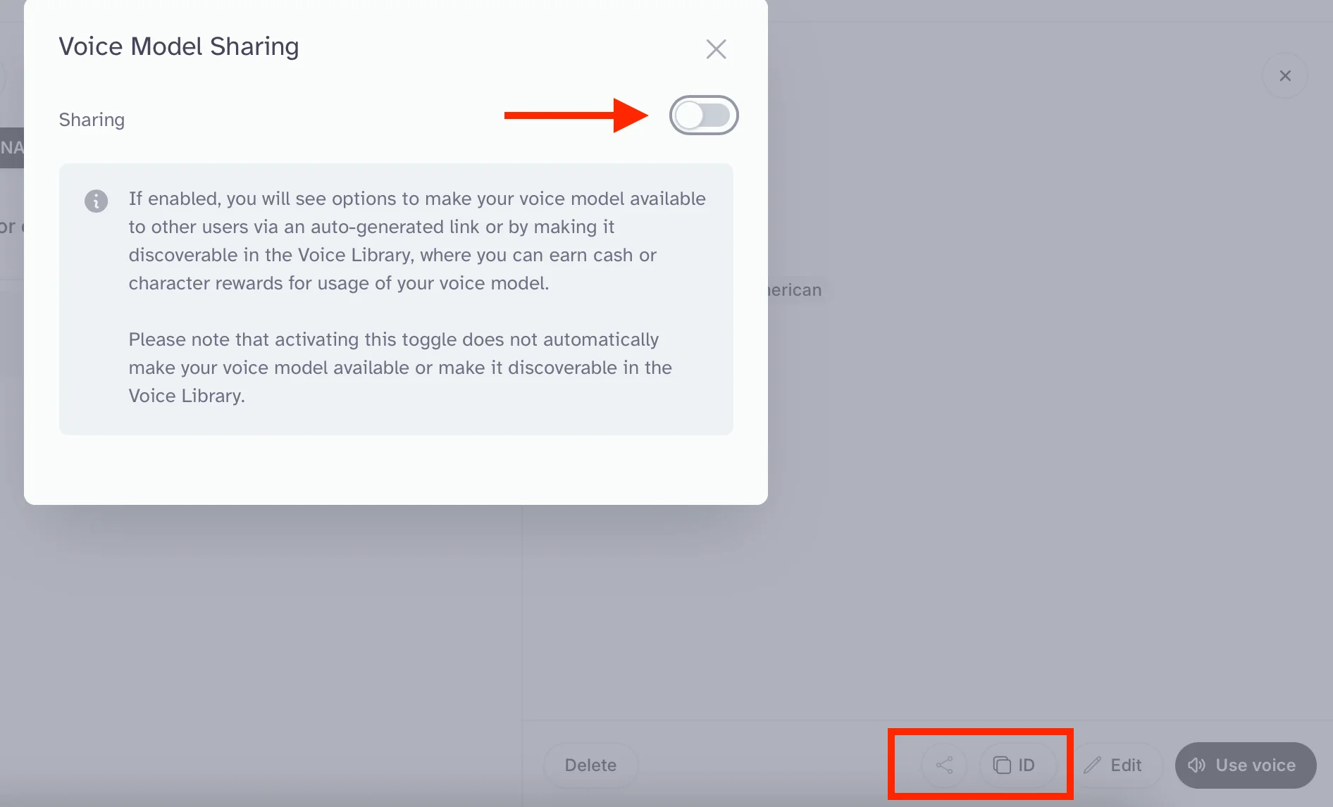 Модель появится в списке ваших голосов в разделе «Voices». Можно поделиться моделью с другими по ссылке или ID. Для этого нажмите на голос, а затем в панели сбоку выберите ID или значок рядом. Во втором случае откроется плашка, где надо переключить «Sharing» в режим «On».