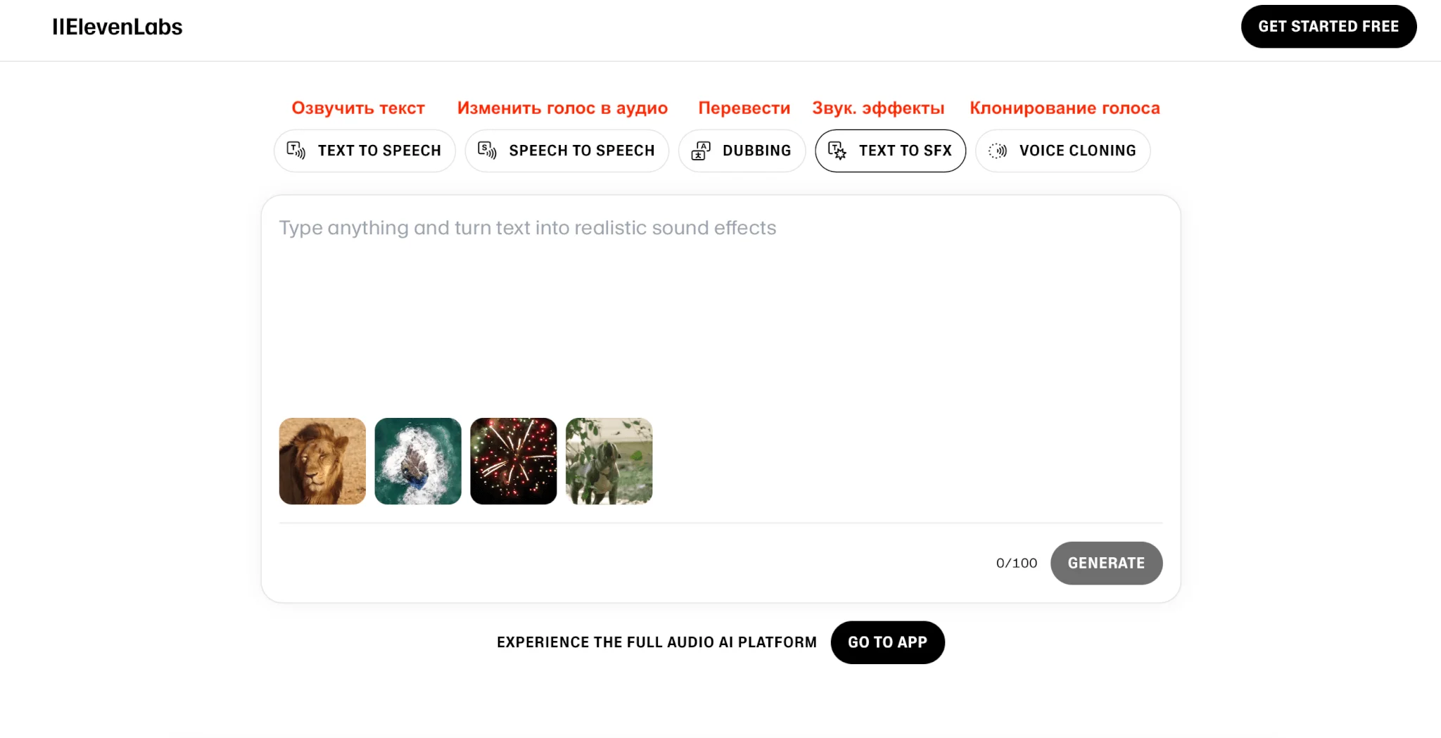 Попробовать сервис можно без регистрации: пролистайте главный экран вниз — там будет окошко с главными функциями. Озвучьте текст, загрузите аудио для изменения голоса, переведите запись или создайте звуковые эффекты. Здесь же есть функция «клонировать голос», но попробовать ее не получится — можно только послушать чужие голоса.