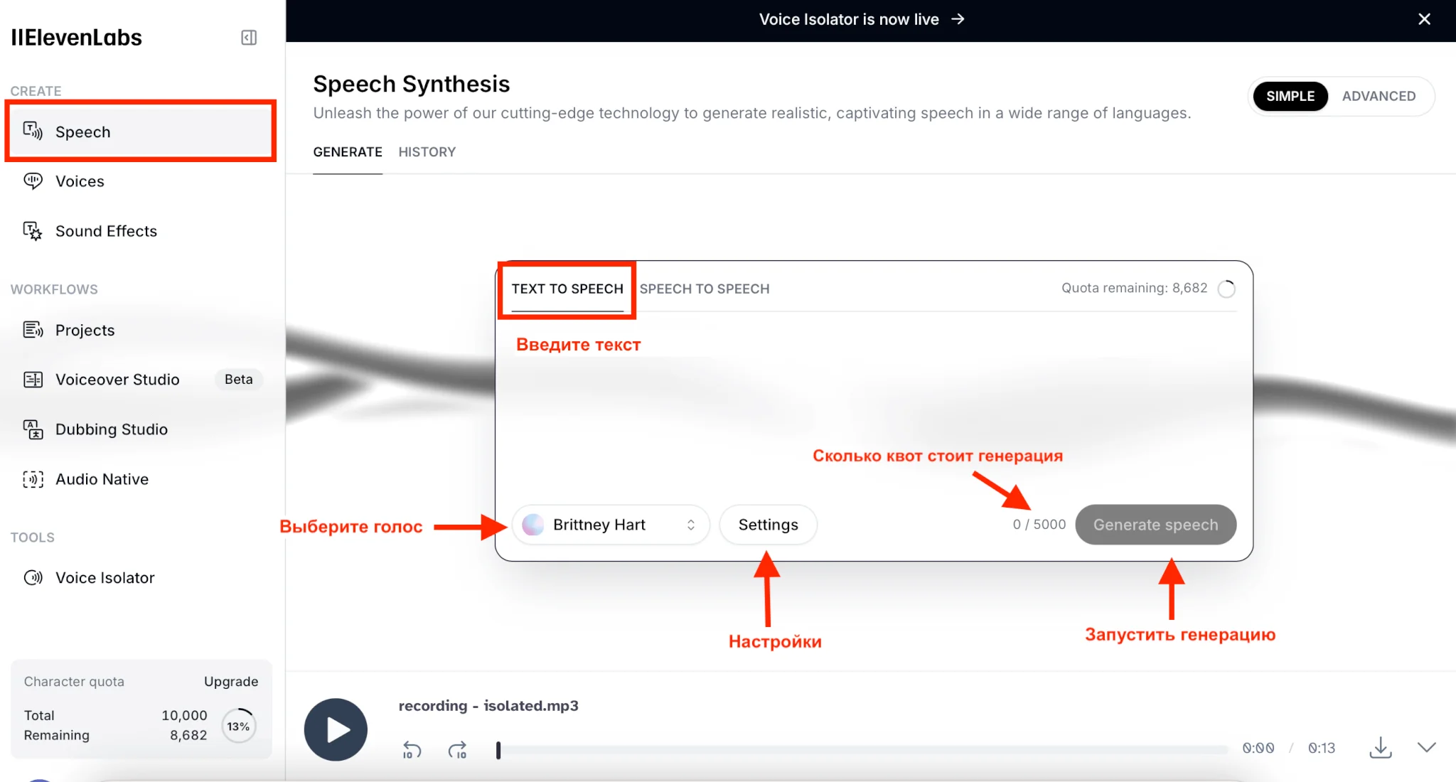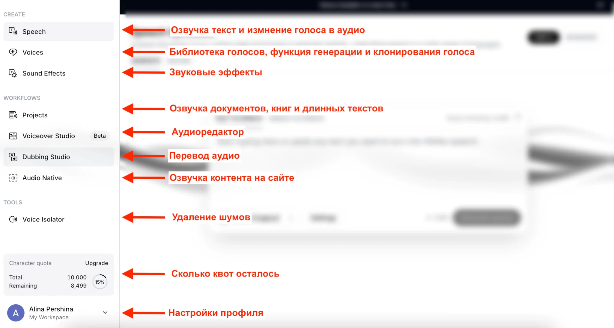 Сбоку — все инструменты ElevenLabs и настройки профиля. Тут же можно посмотреть, сколько у вас осталось квот для генераций.