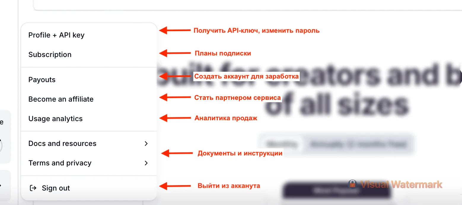 Заглянем в настройки аккаунта, щелкнув по никнейму. Здесь можно изменить пароль, получить API-ключ для интеграции с другими сервисами, вступить в партнерку сервиса, создать дополнительный аккаунт для заработка на своих голосах и проанализировать продажи.
