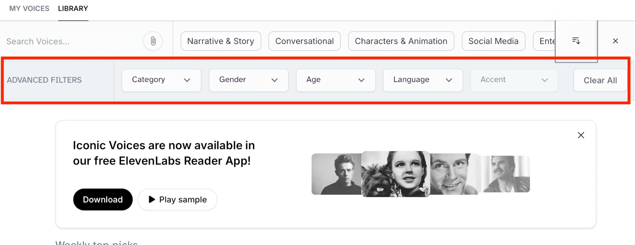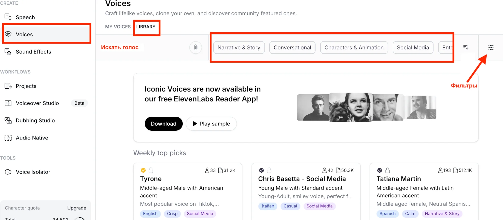 В библиотеке голосовых моделей «Voices» лежат сотни голосов под разные задачи. Голоса можно сортировать по типам контента, для которых они подойдут. Например, для озвучки книг, статей или разговоров. Нажмите на иконку ползунков, чтобы открыть дополнительные фильтры.