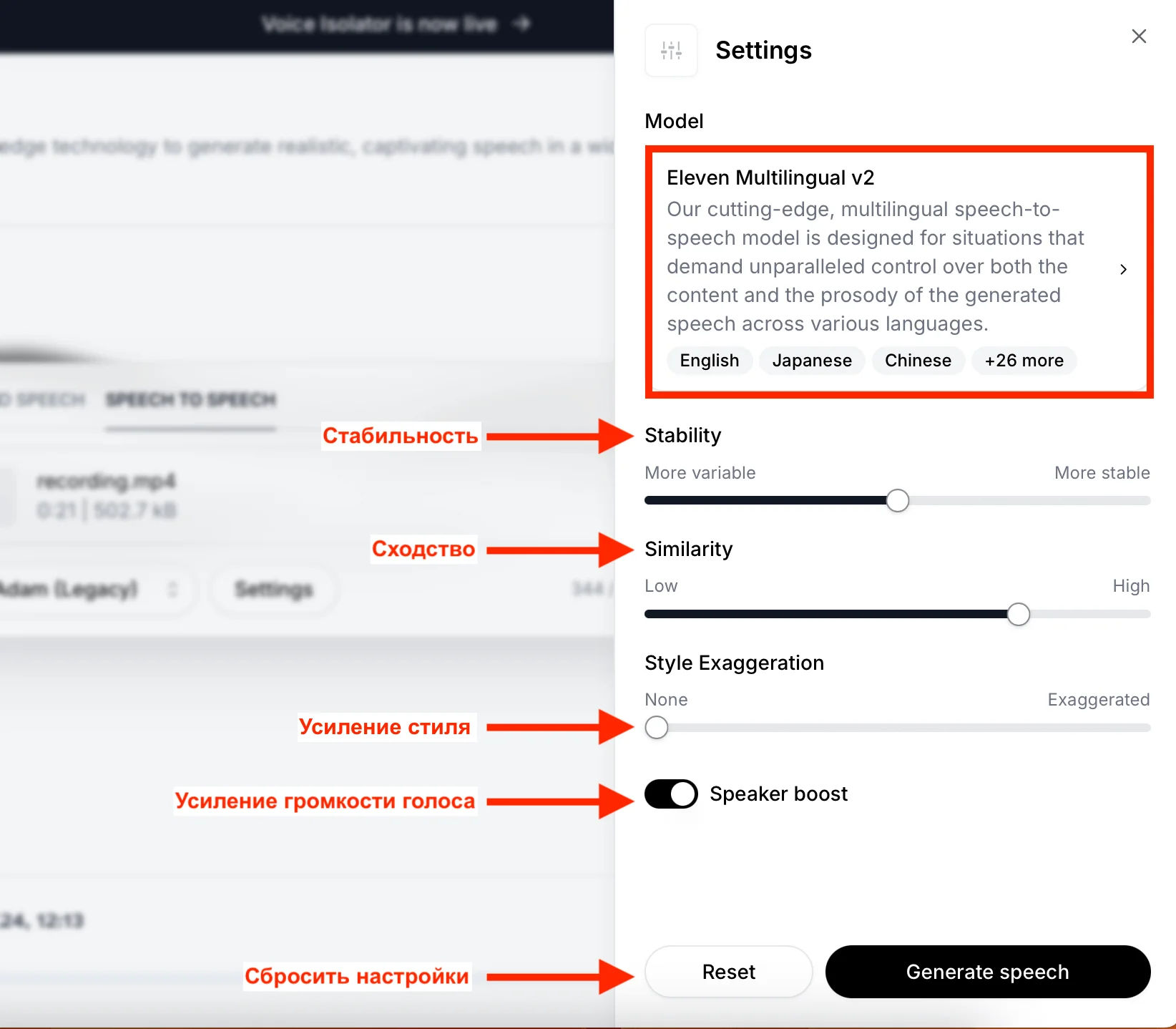 В настройках проверьте, что используете последние модели: продвинутую «Eleven Multilingual v 2» или быструю «Eleven Turbo v 2.5».