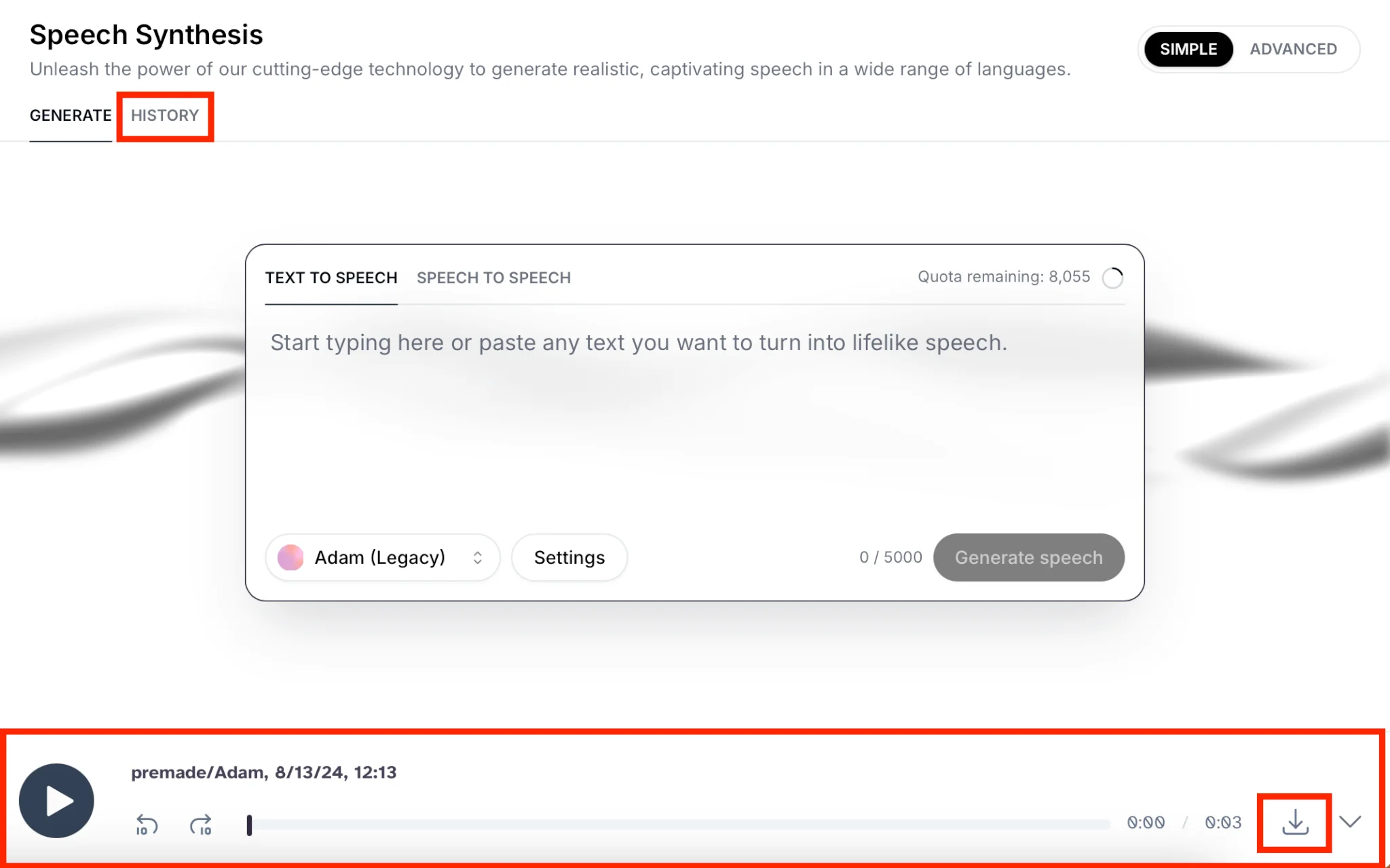 Готовые аудио появляются внизу экрана и в истории генераций. Нажмите на значок загрузки рядом с аудио, чтобы скачать.