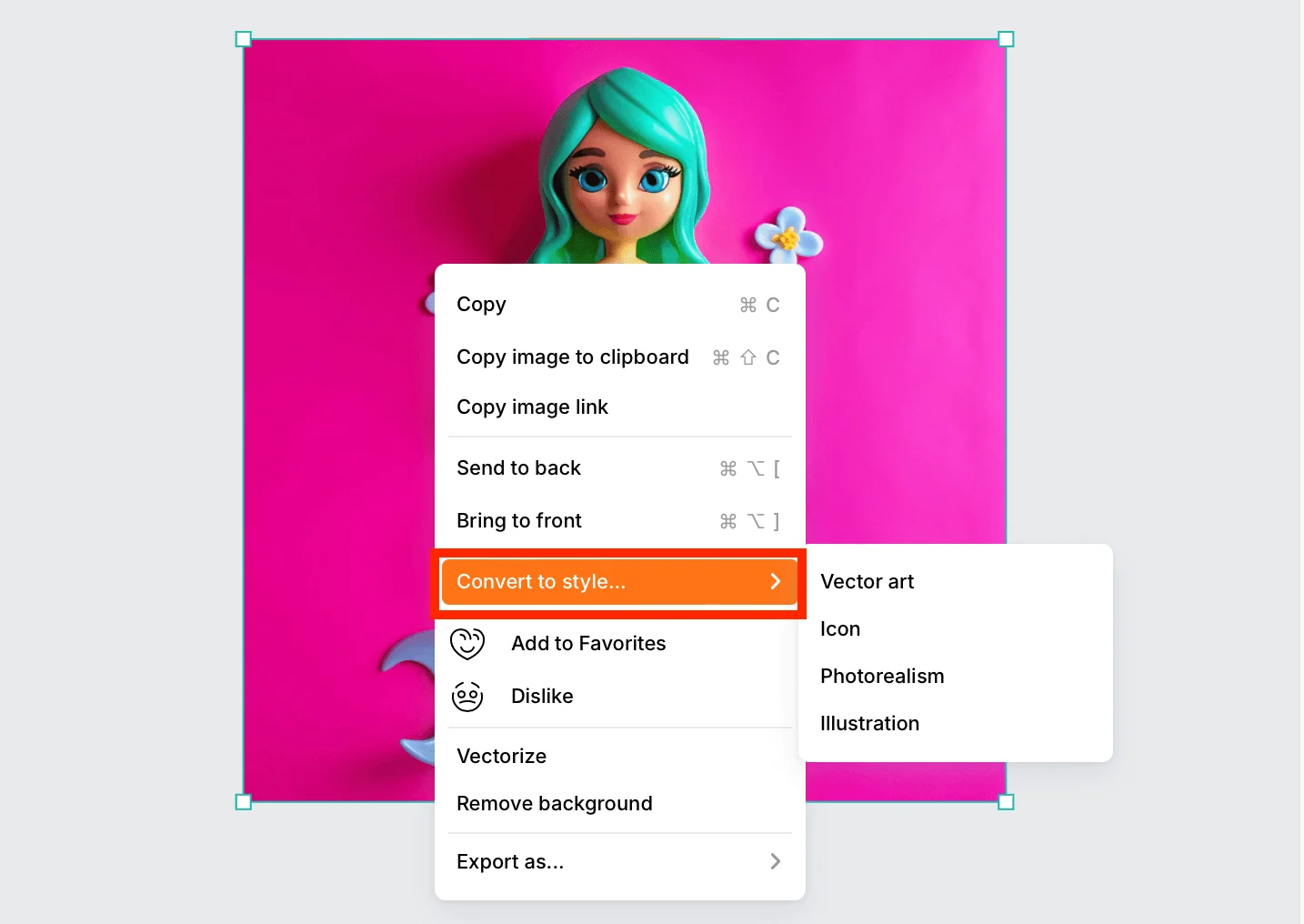 Если результат понравился, сохраните его в стилях для будущих работ: щелкните правой кнопкой мыши по изображению и выберите Convert to style. Поместите генерацию в нужную папку со стилями: векторное изображение, иконка, фотореалистичная картинка, иллюстрация.
