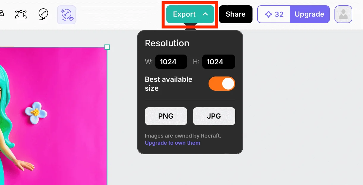 Улучшить качество изображения поможет функция Clarity Upscale в верхней панели. Она доступна бесплатно для обычных картинок, а векторные объекты апскейлить могут только владельцы подписки.