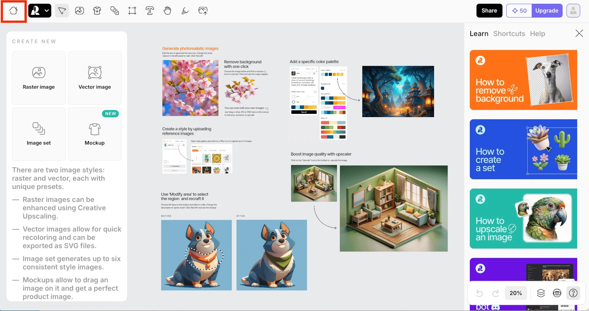 Перед вами откроется интерфейс сервиса, напоминающий Figma. Справа будут обучающие видео на английском языке работает Recraft.