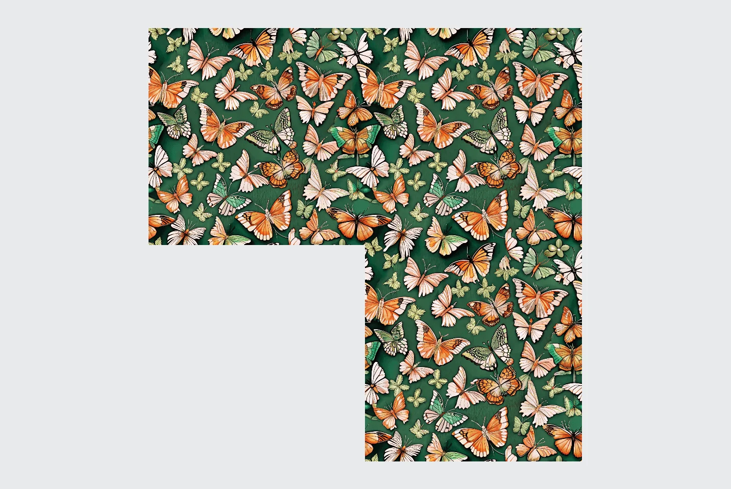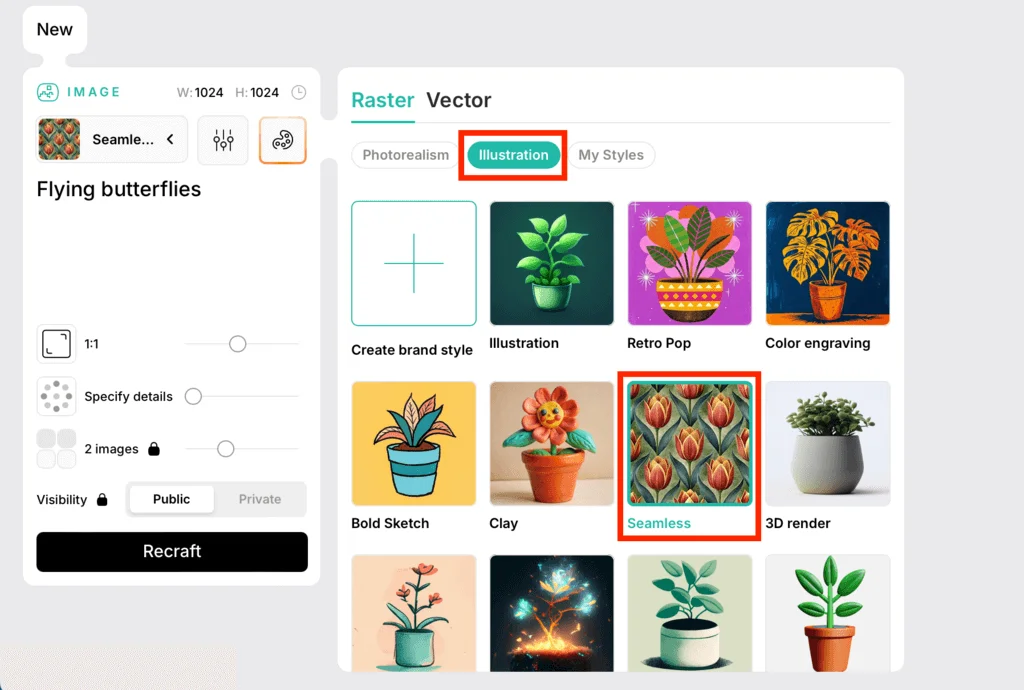 Создайте яркий фон с узором для дизайна сайта — среди стилей в разделе Illustrations выберите Seamless. Введите в промпте описание принта — у нас это порхающие бабочки.