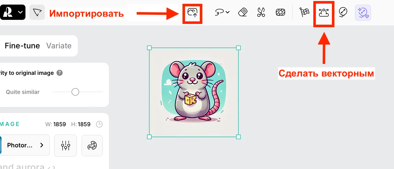 Любое загруженное изображение размером от 16 мегапикселей Recraft преобразует в векторное. Для этого импортируйте файл в формате PNG или JPG и нажмите на иконку Vectorize.