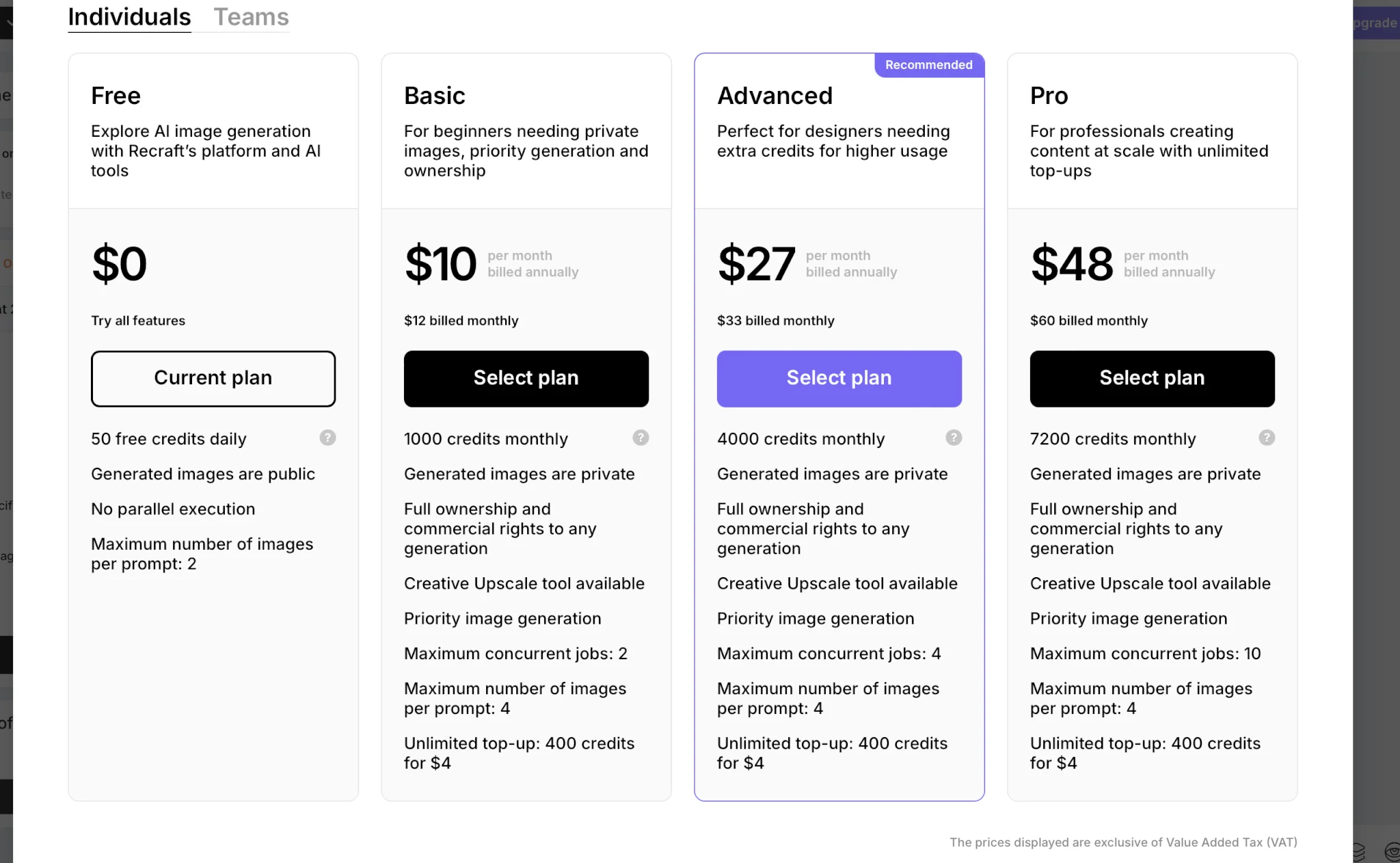 В платных планах доступен режим приватности — изображения не будут видны другим пользователям. Кроме того, у вас будут коммерческие права на созданные работы. Никто не сможет использовать ваши изображения без вашего согласия, даже если они размещены на платформе. Подписка также даёт возможность генерировать до 4 изображений за один промпт и использовать Creative Upscale Tool для улучшения качества векторных изображений ( от 16 до 256 мегапикселей). В бесплатной версии можно улучшать только обычные изображения размером от 20 мегапикселей.