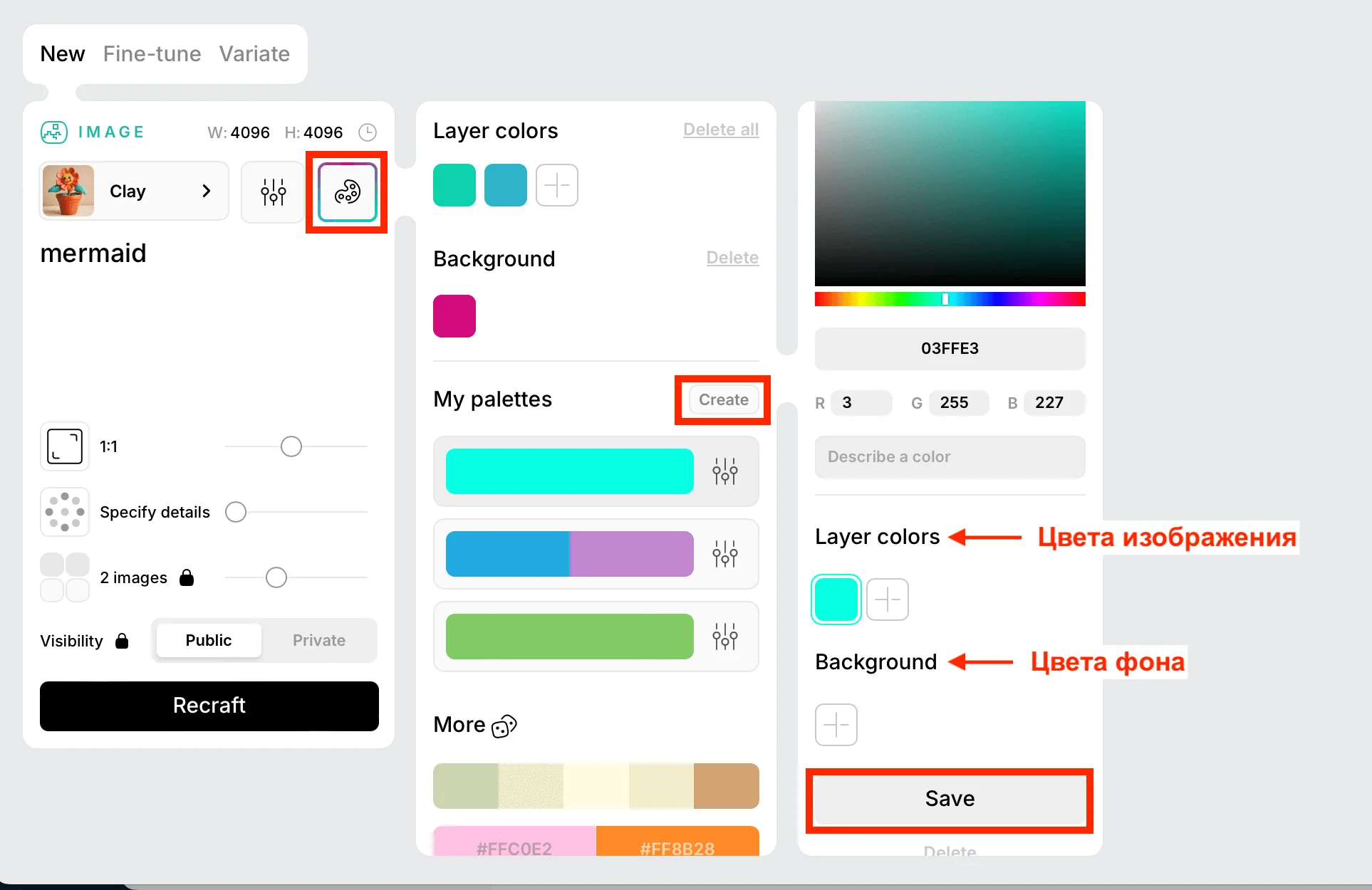 Настройте цвета для генерации. Нажмите на палитру, выберите нужные оттенки для фона и самого изображения или создайте собственную палетку.