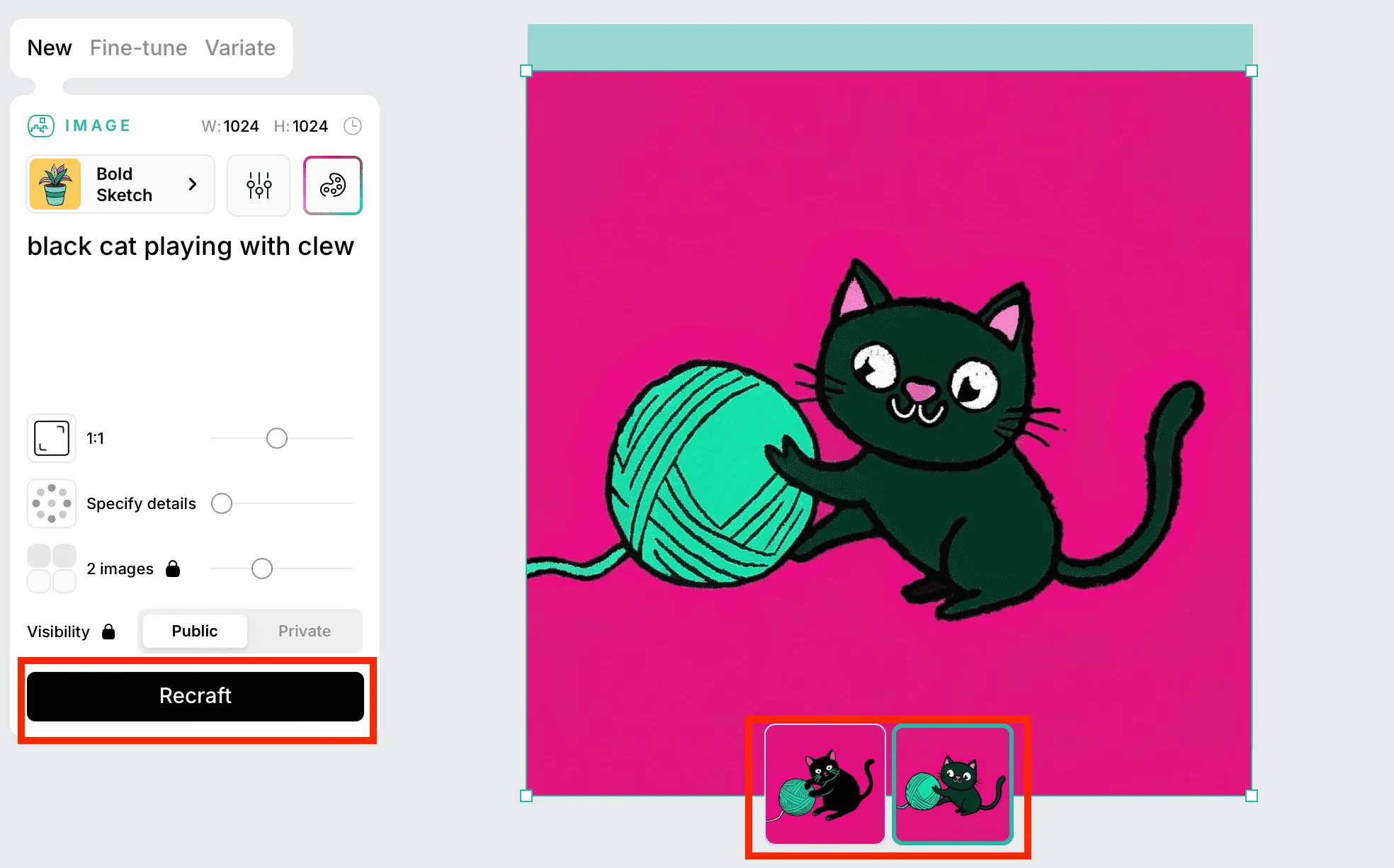 Нажмите Recraft и подождите около 20 секунд. Нейросеть создаст два варианта изображения. Выберите понравившийся или нажмите Modify Image и получите еще два новых варианта.