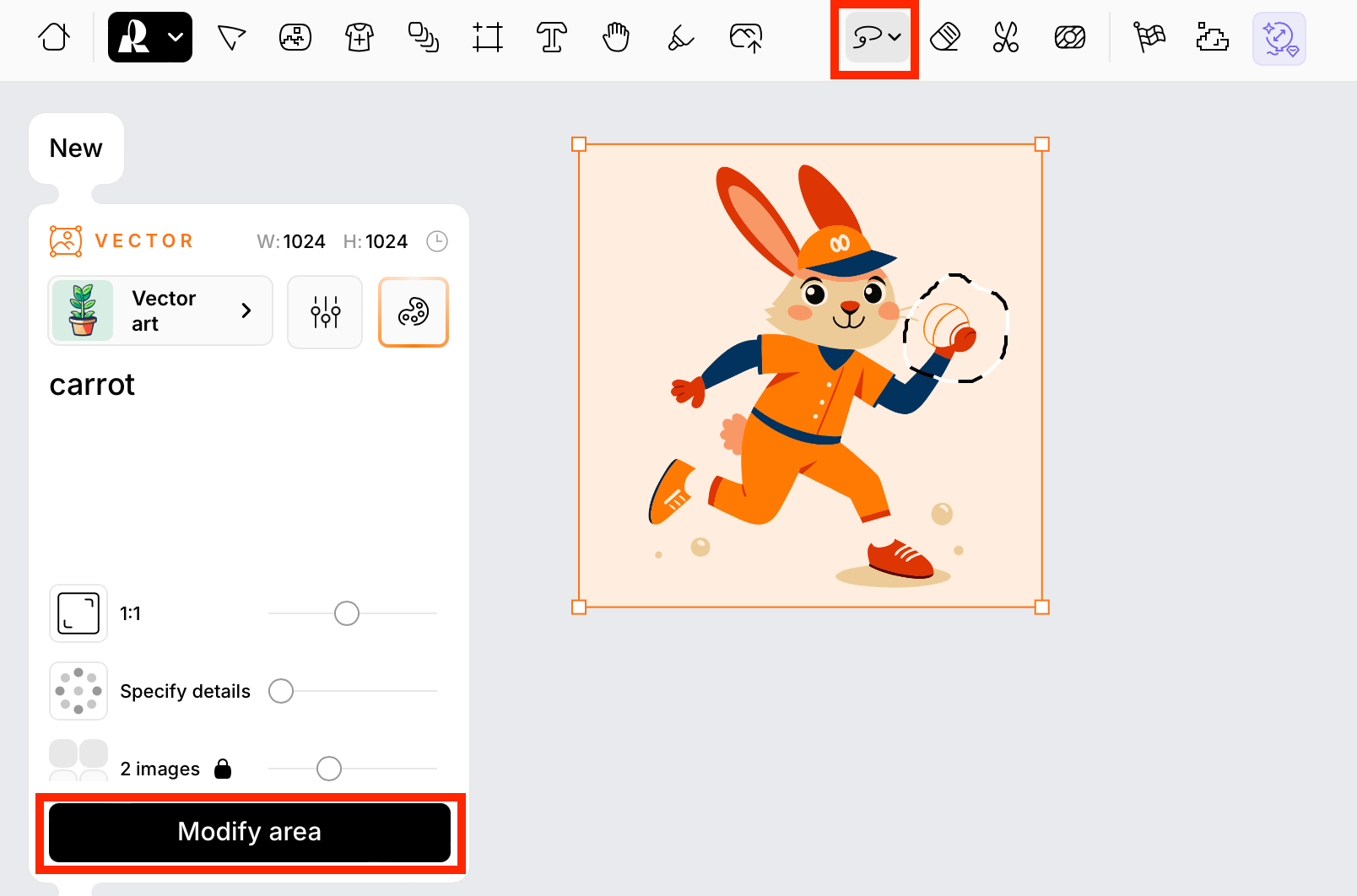 Также в Recraft можно изменить детали на изображении. С помощью лассо обведите часть, которую хотите поправить, затем введите промпт и нажмите Modify area.