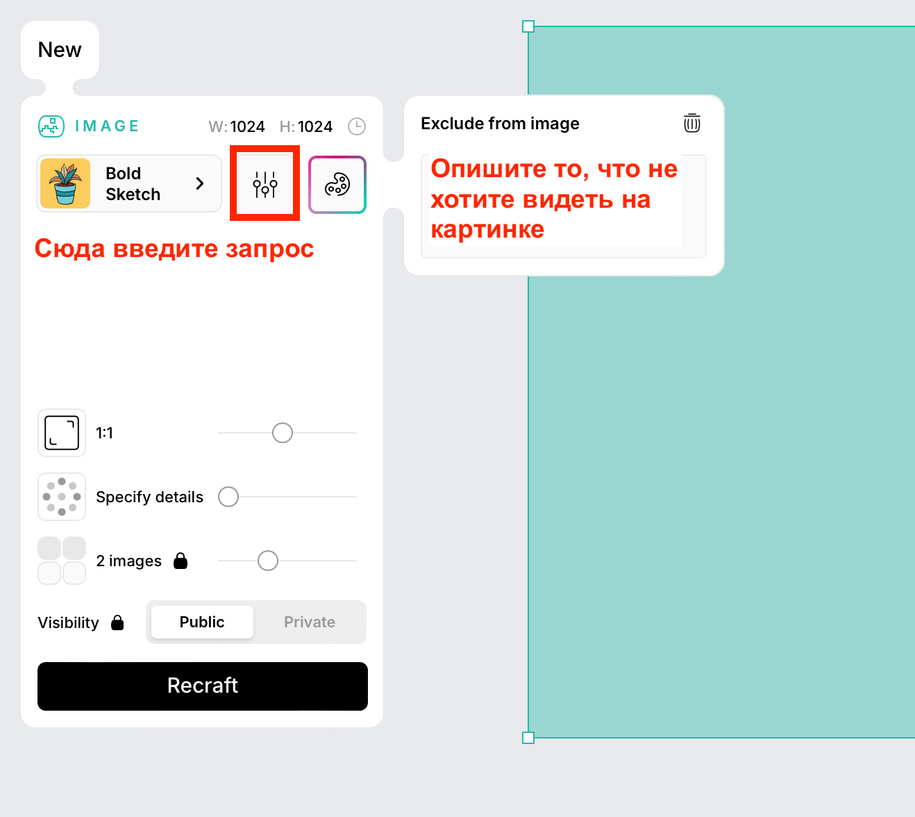 Введите текстовое описание изображения на английском языке в поле для ввода. Нажмите на значок контроллера, чтобы исключить нежелательные объекты. Напишите, что нужно убрать с картинки.