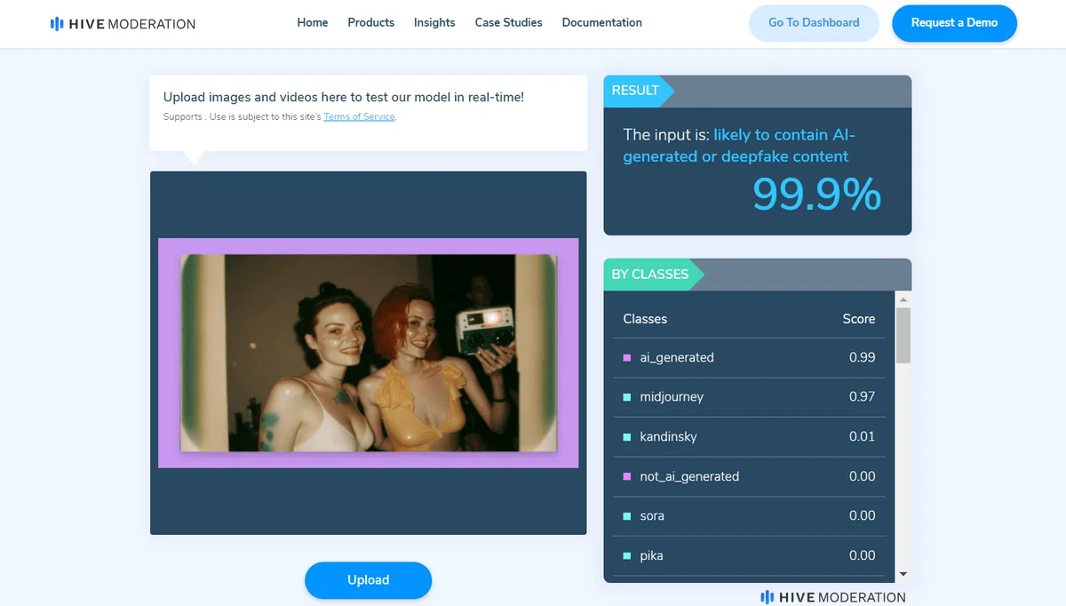 На платформе Hive есть разные инструменты для использования ИИ. В том числе, инструмент для проверки реальности картинки. Ответ сервиса лаконичен: сгенерирован ИИ, не сгенерирован ИИ.