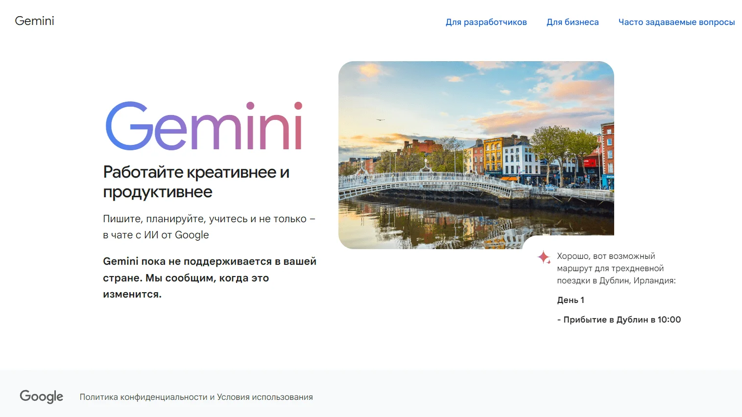 Доступ к нейросети в России ограничен. Если зайдете на официальный сайт сервиса, увидите надпись: «Gemini пока не поддерживается в вашей стране. Мы сообщим, когда это изменится».
