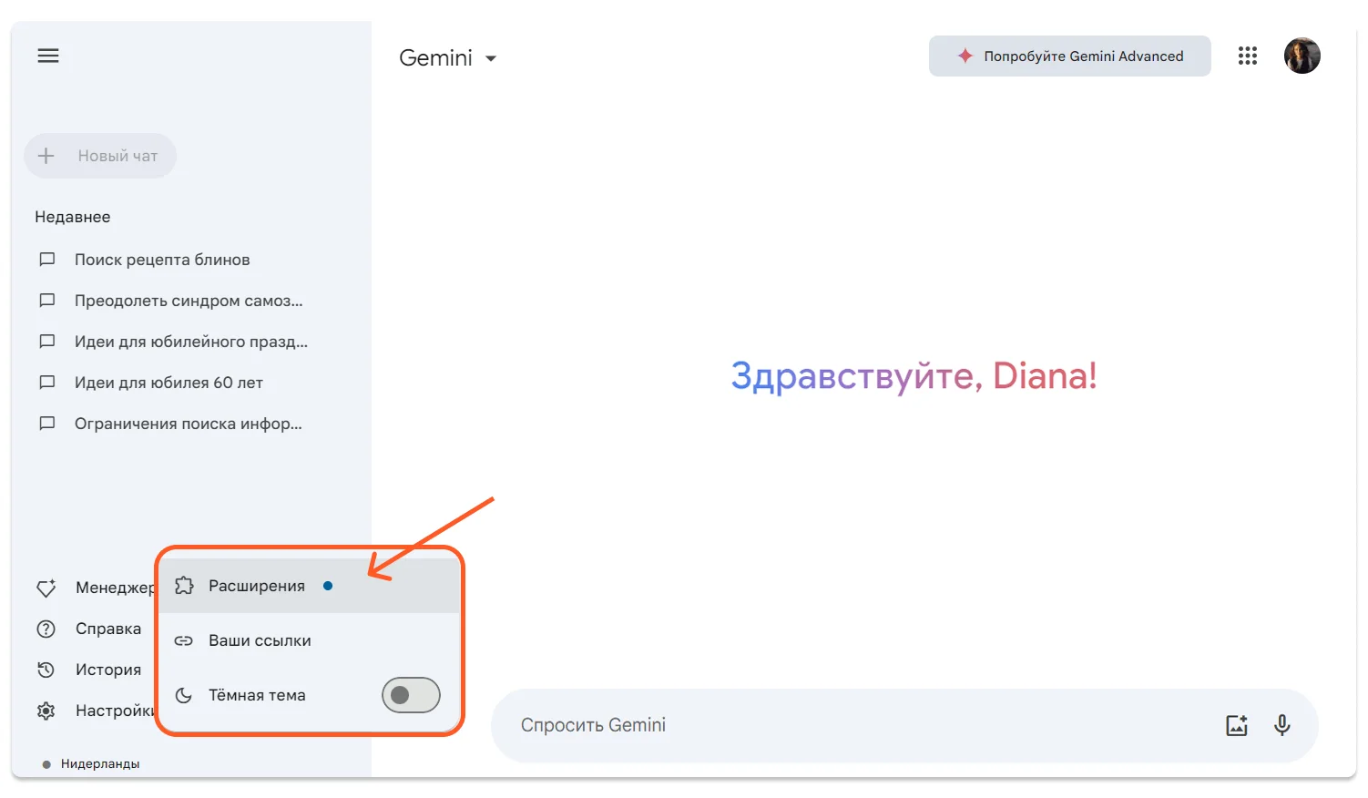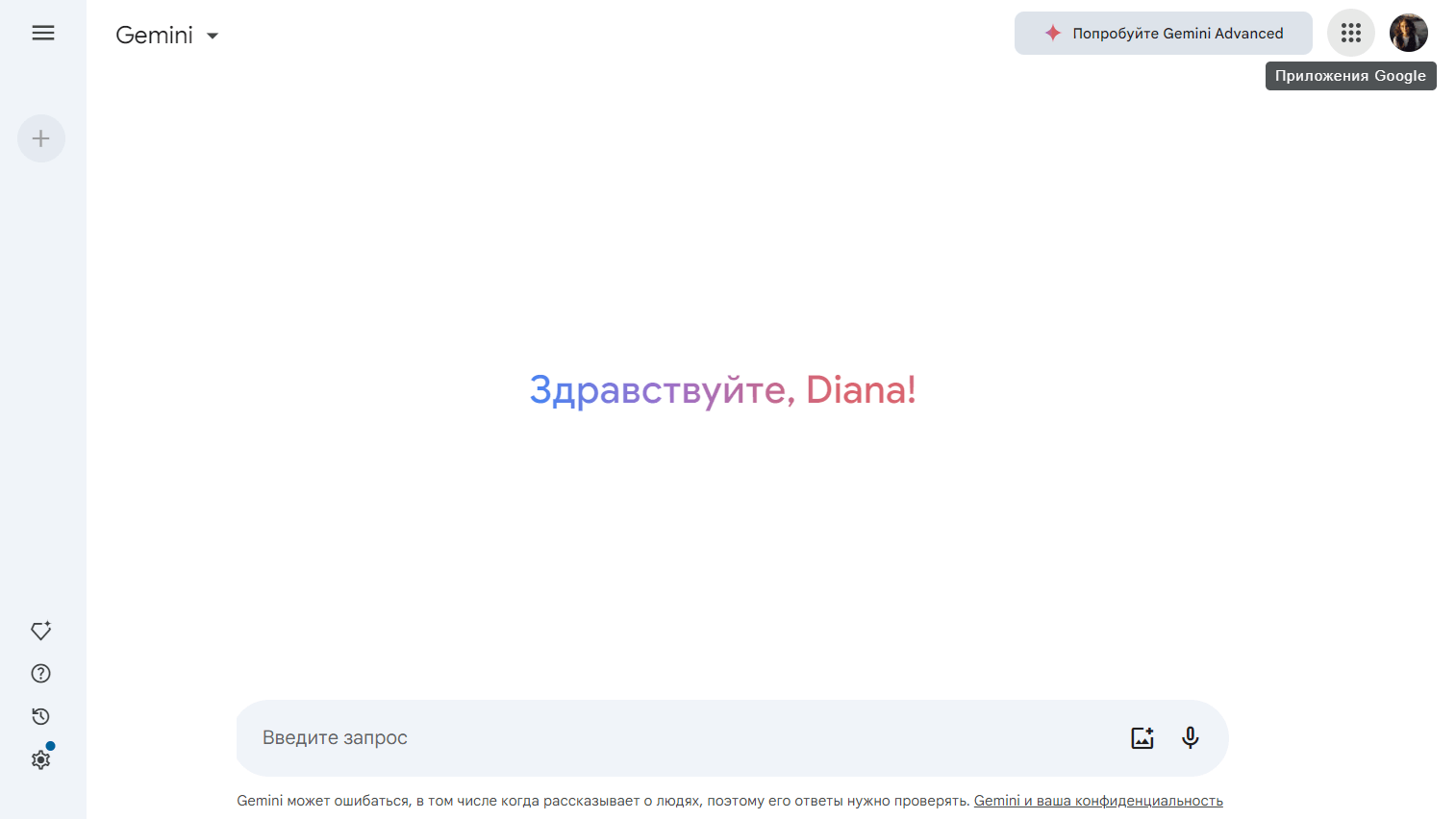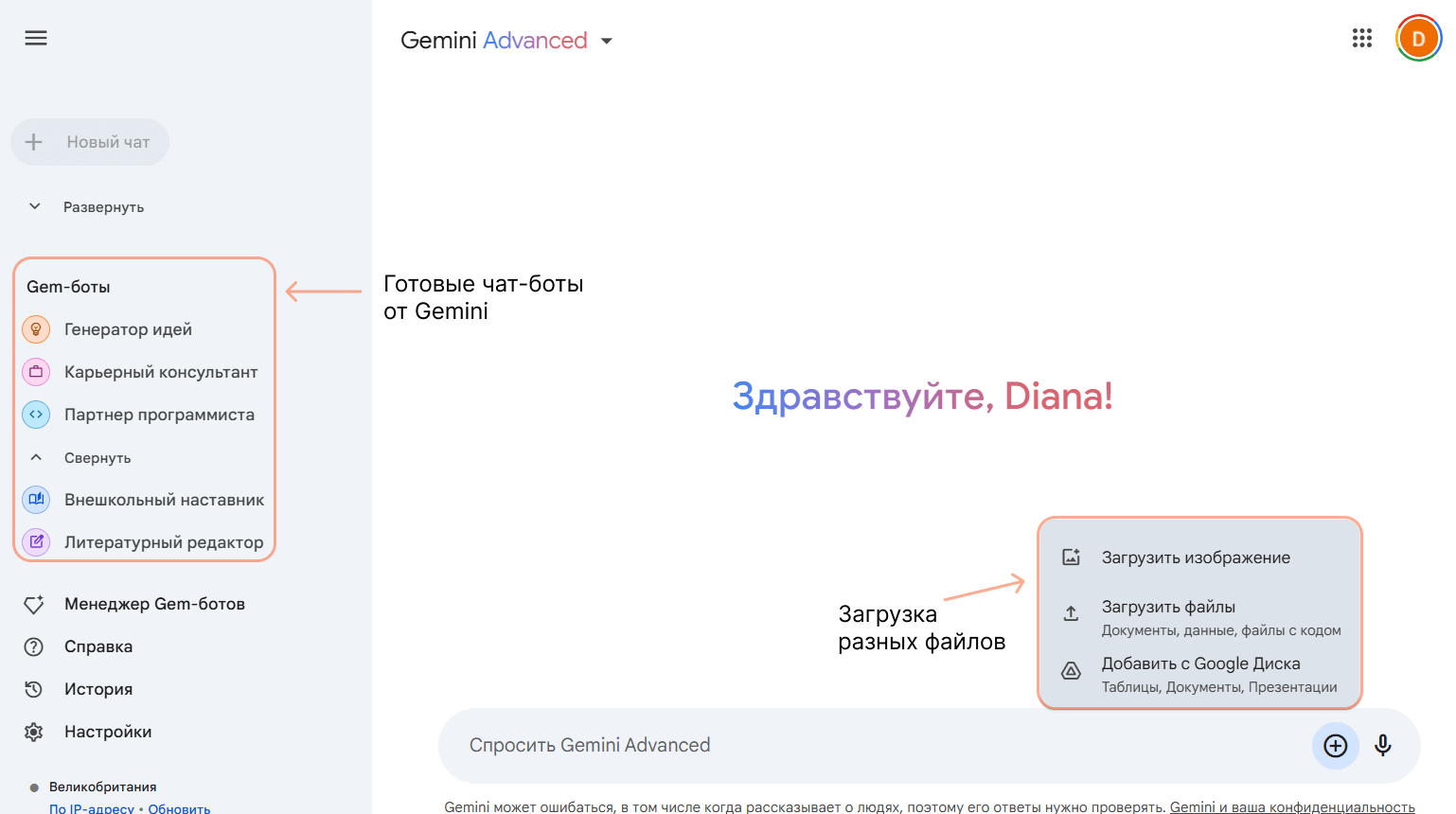 У Gemini Advanced есть пара дополнительных кнопок и разделов. Слева — быстрый доступ к ботам сервиса, а по кнопке «Загрузить файл» можно добавить изображение, файл или загрузить его с Google Диска.