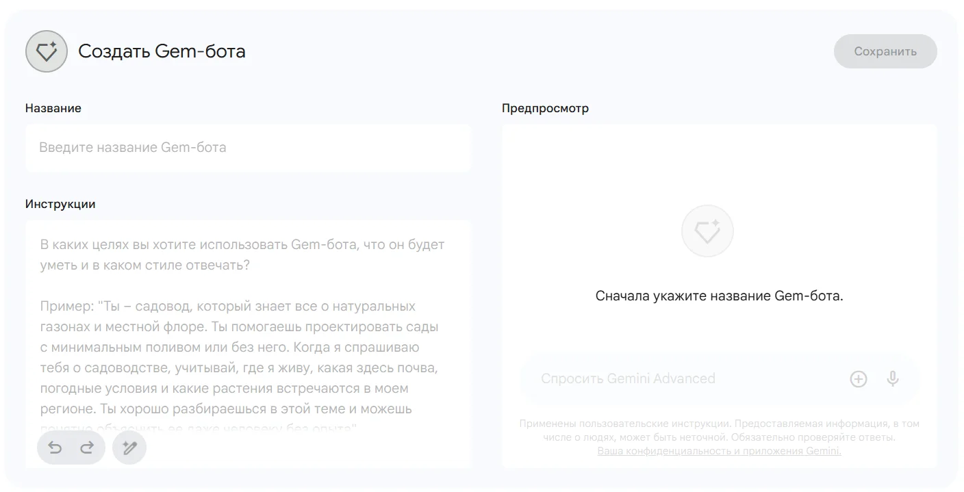 Своего Gem-бота могут создать только пользователи с Gemini Advanced. Для этого нужно зайти в раздел «Менеджер Gem-ботов», ввести название и составить промпт для задачи.