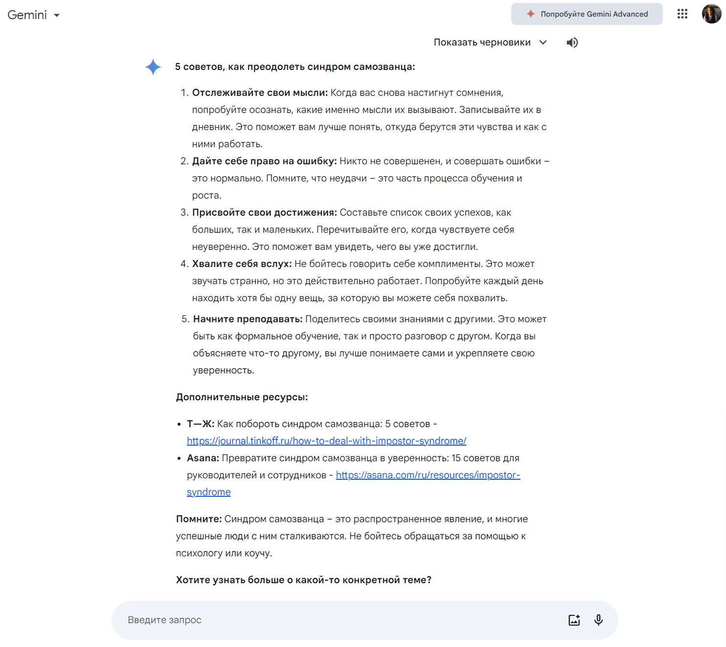 С обычными текстовыми задачами обе модели справляются отлично. Иногда даже 1.5 Flash дает более исчерпывающие ответы. Вот пример ответа 1.5 Flash на вопрос «Как справиться с синдромом самозванца».