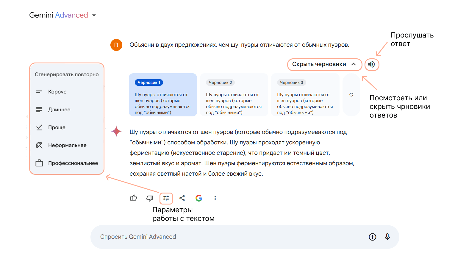 У сервиса есть несколько полезных кнопок для работы с текстом. Можно прослушать ответ и посмотреть черновики.