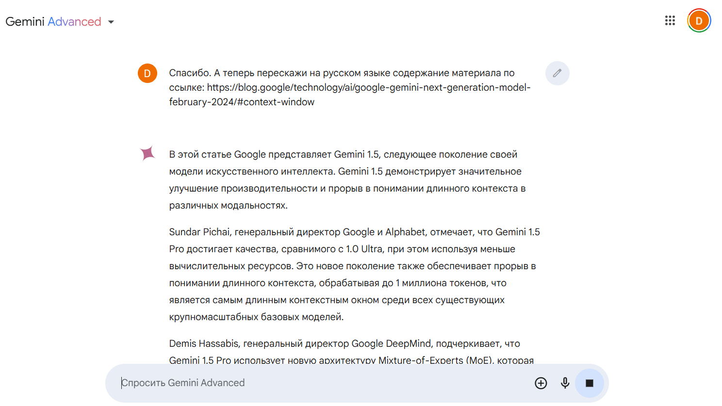 - Расширенный контекст. У Gemini 1.5 Pro контекстное окно составляет один миллион токенов. Это значит, что модель может «запомнить» содержание 1500 страниц текста и ответить на вопросы по нему.