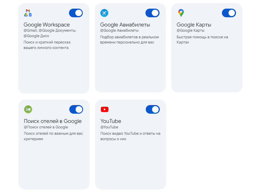 Gemini можно превратить в личного помощника с доступом к Gmail, Google Диск, Youtube, Google Документам, картам и поиску отелей. Чтобы начать пользоваться расширениями, сначала нужно включить их.