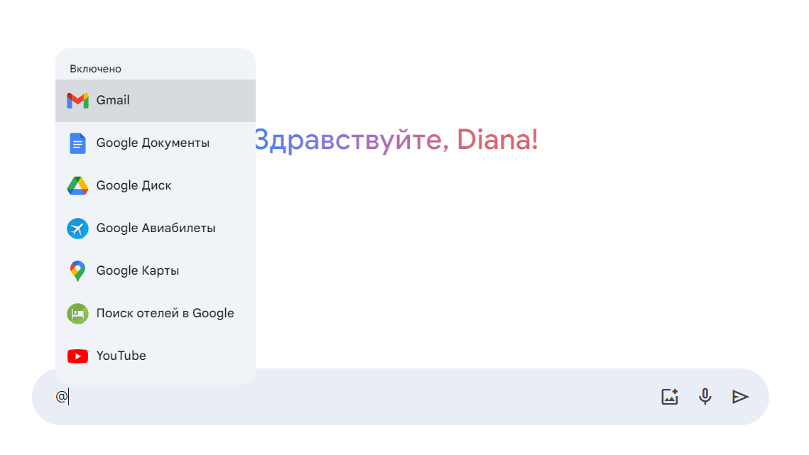 Чтобы использовать расширения, введите «@» в строке запроса Gemini. Затем выберите сервис и поставьте ему задачу.