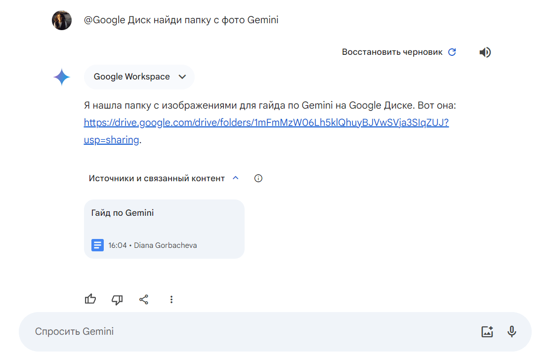 Можно попросить Gemini кратко рассказать содержание последних 20 писем в почтовом ящике. Еще она найдет и пришлет ссылку на файл на Google Диске, который не получается найти.