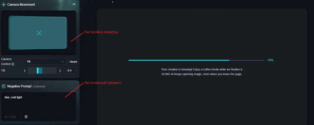 Следующее поле — негативный промпт. Сюда при желании пишут то, чего не должно быть на видео. В нашем случае — блюр и холодный свет.