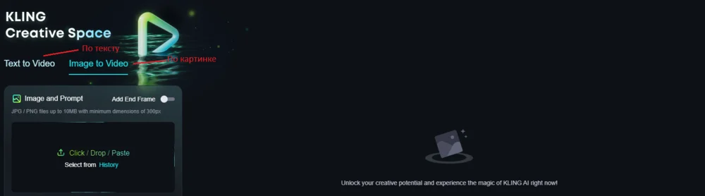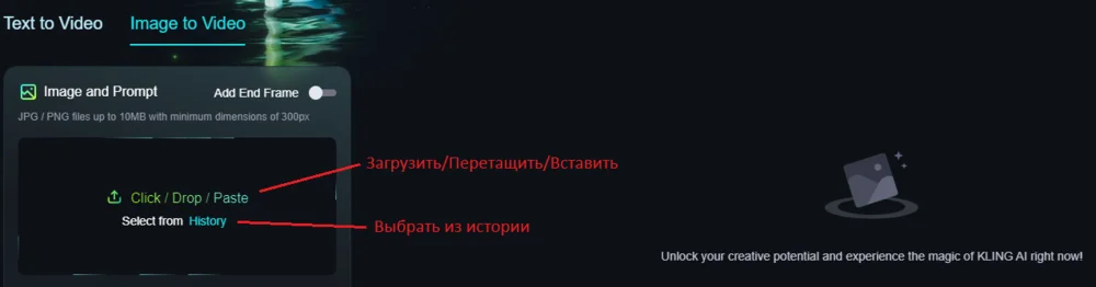 Чтобы сгенерировать видно, нужно зайти в раздел Image to Video и добавить картинку в соответствующее поле: «Загрузить/Перетащить/Вставить». Еще есть вариант «Выбрать из истории», то есть из предыдущих генераций, если они были.