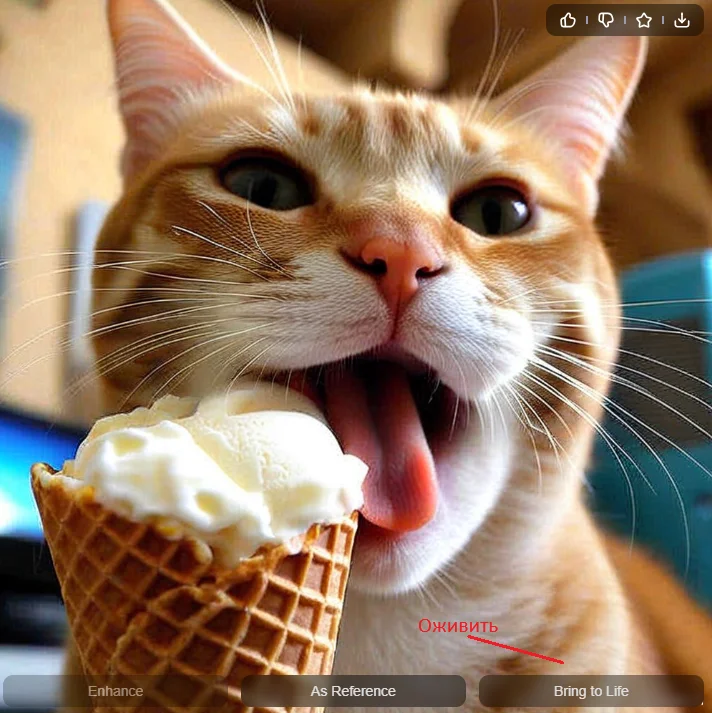 Другой способ — найти одну из сгенерированных нами картинок, открыть ее и внизу нажать Bring to Life (Оживить). Сделаем видео на примере созданного ранее кота с мороженым.