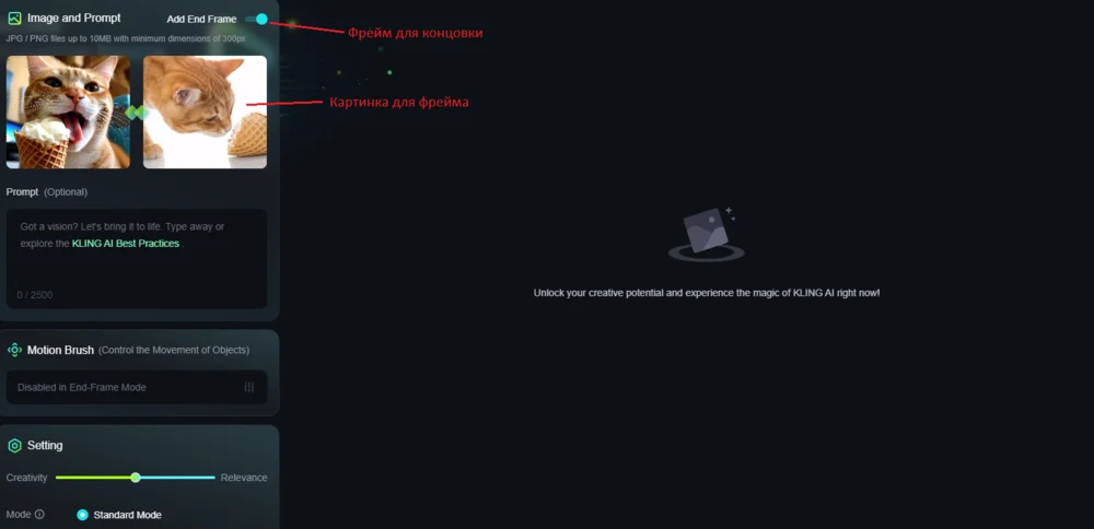 Генерация видео по картинке. Генерировать по картинке можно 2 способами: с финальным фреймом и без него. Финальный фрейм — это конечный кадр, к которому должна прийти нейронка. Если добавить финальный фрейм, то остальные настройки генерации будут недоступны.