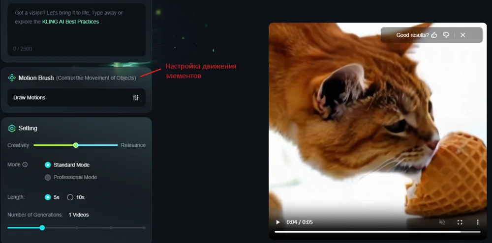 - В профессиональном режиме можно создавать любые видео, где нужно показать большое количество деталей и цветов или сложную композицию. Но сложные движения здесь лучше не генерировать — они получатся рваными.