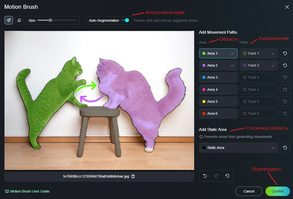 Нажимаем на Area в столбце справа от рабочего поля, закрашиваем нужную область, кликаем на Track рядом с Area и рисуем стрелочку — в этом направлении будет двигаться объект. В моем примере будут два кота, которые потянутся друг к другу. Их разделяет табуретка — ее сделаем статичной зоной, чтобы она не сдвинулась во время кошачьих игр. Для этого в правой половине окна находим Add Static Area, кликаем на поле и выделяем область на изображении.