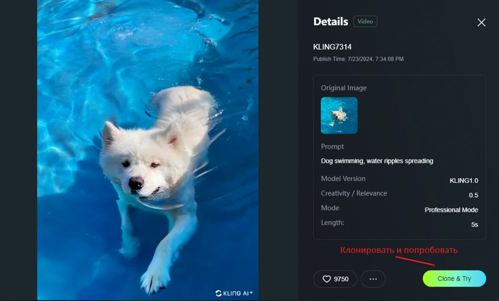 Генерация на основе другого видео. За 10 кредитов можно клонировать чужой ролик, выложенный на сайте, и использовать его в своей работе. Для этого выбираем понравившееся видео и нажимаем Clone&Try.
