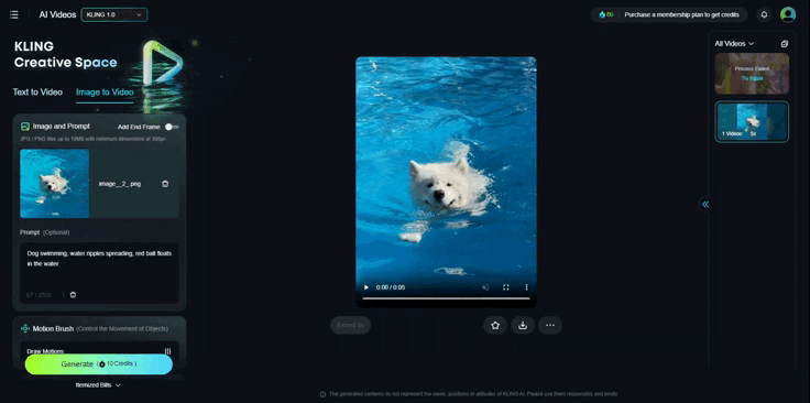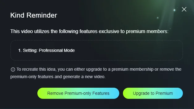Этот ролик создан на базе картинки по промпту “dog swimming, water ripples spreading” («собака плавает, идет рябь по воде»), дополнительных параметров нет. Если попробовать сгенерировать видео на его основе, всплывает напоминание о том, что придется убрать фишки, доступные только с премиумом-тарифом, а именно — профессиональный режим.