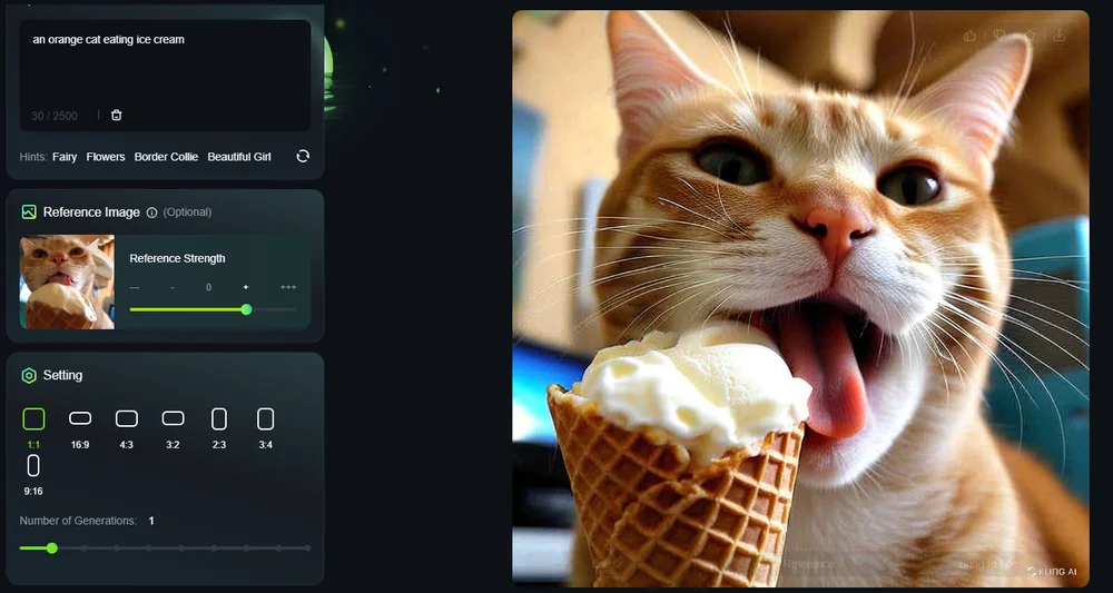 Для создания картинки нужно перейти в раздел AI Images и ввести текстовый промпт. Например, “an orange cat eating ice cream”, т.е. «оранжевый кот ест мороженое». Дополнительно можно загрузить референсное изображение, на которое нейросеть будет ориентироваться при генерации. Это необязательно, но повышает точность генерации. Рядом с картинкой есть ползунок, который регулирует силу референса — насколько исходник будет влиять на результат.