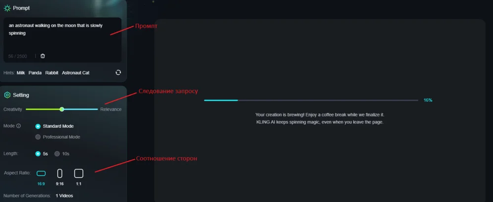 Для примера мы задали промпт “an astronaut walking on the moon that is slowly spinning” («астронавт гуляет по Луне, которая медленно вращается»). Оставили стандартный формат 16:9 и среднюю степень следования запросу.