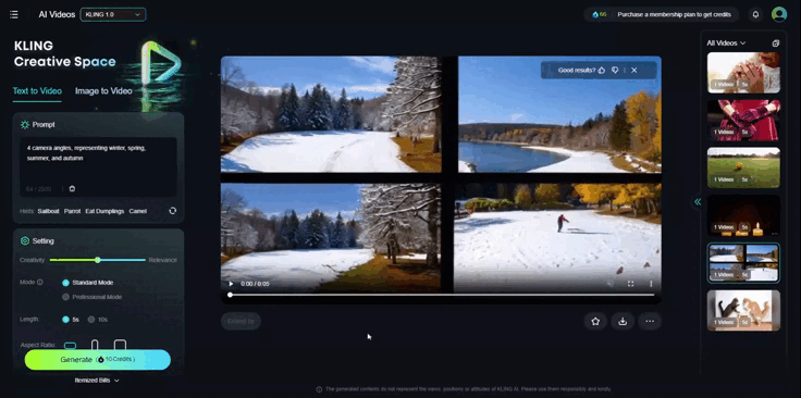 Также генерацию можно разделить на 4 части. Для этого в начале запроса нужно написать 4 camera angles. Вот пример промпта: “4 camera angles, representing winter, spring, summer, and autumn” («4 ракурса камеры, представляющие зиму, весну, лето и осень»).