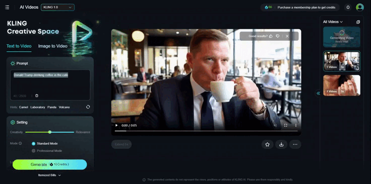 Реальных людей сервис не генерирует — вероятно, из этических соображений. По запросу “Donald Trump drinking coffee in the cafe” («Дональд Трамп пьет кофе в кафе») выдает ролик с неизвестным мужчиной в костюме.