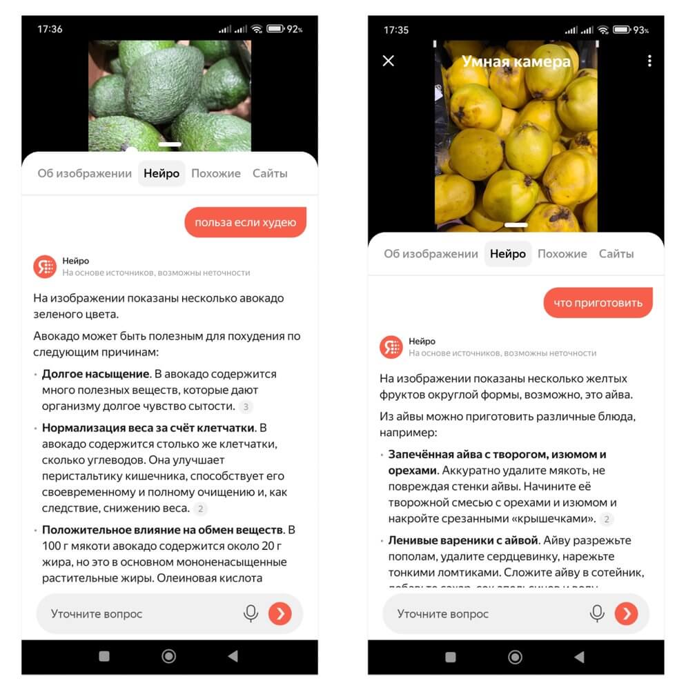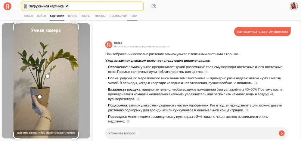 Анализировать фото. В поиск можно добавить снимок или картинку из интернета и попросить Нейро ответить на вопрос по изображению. Функция подойдет, чтобы решить бытовые задачи — выбрать технику или комнатное растение в магазине, научиться краситься и стильно одеваться, готовить необычный продукт.