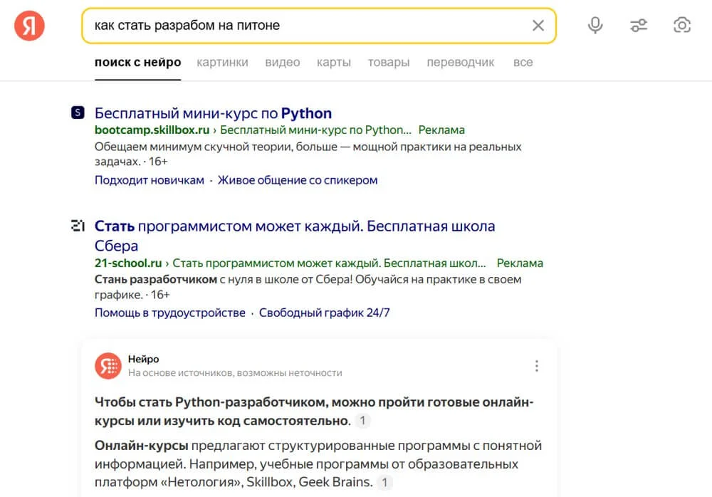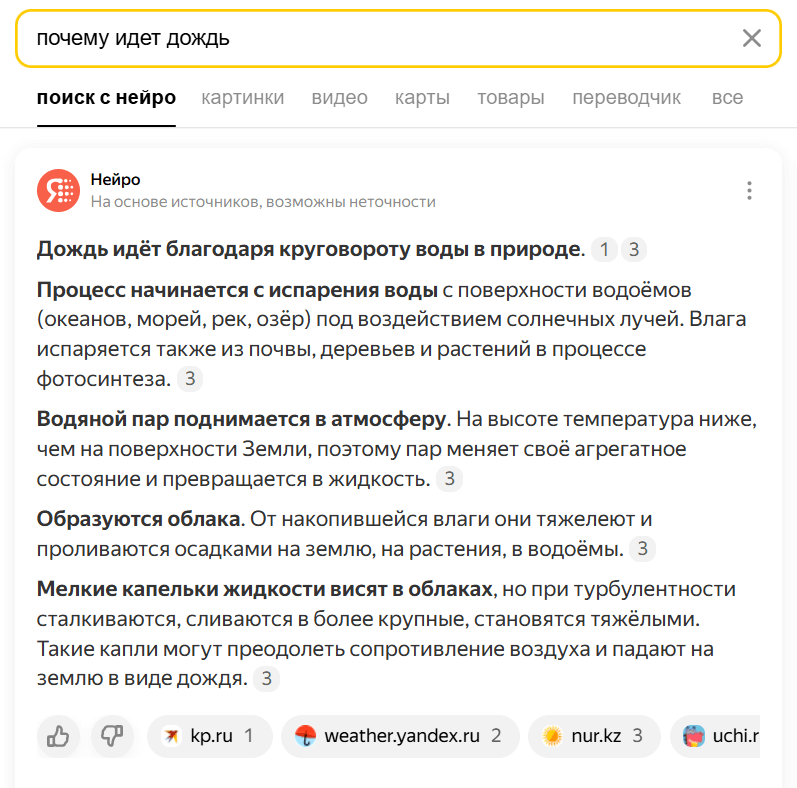 Сервис с искусственным интеллектом изменяет поисковую выдачу — часто блок Нейро встает выше, чем рекламные баннеры и статьи с хорошей SEO-оптимизацией. Кроме того, пользователи уже видят ответ на свой вопрос, а за деталями скорее всего пойдут в один из источников, которые отобразились в Нейро.