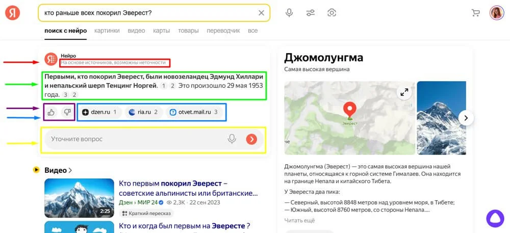 Ответ Нейро основан на работе модели YandexGPT и состоит из 5 основных элементов: