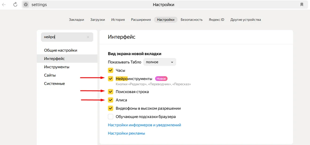 Если поиск с Нейро не устраивает, его можно выключить — как и другие опции на основе нейросетей. Для этого нужно открыть настройки Яндекс Браузера и перейти в раздел «Интерфейс», либо ввести в поиск «нейро». А затем убрать галочки с соответствующих разделов.