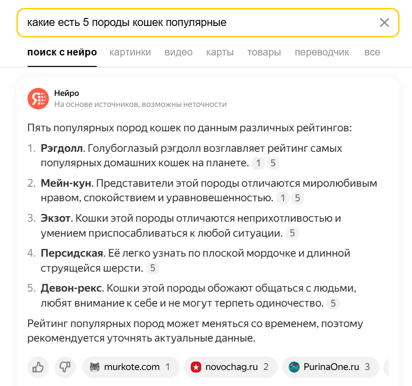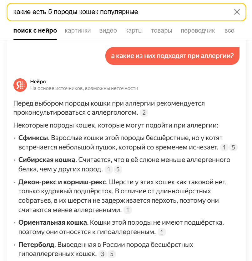 Я дала Нейро запрос с грамматическими ошибками — попросила назвать 5 популярных пород кошек. Когда она справилась с задачей, я продолжила диалог и спросила — какую кошку можно завести при аллергии. Нейро запомнила контекст и составила 5 новых вариантов.