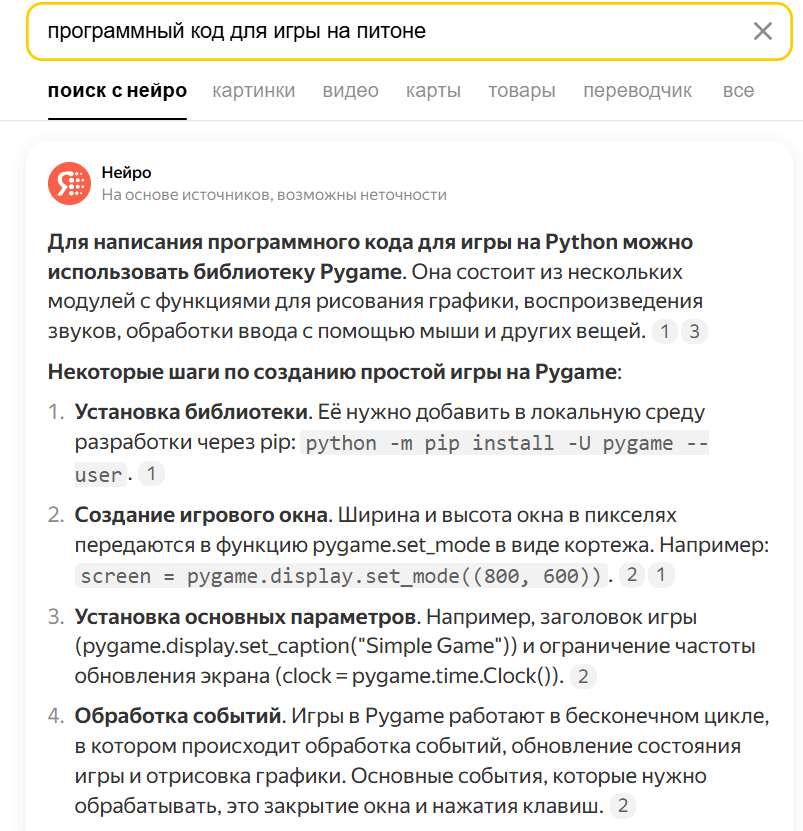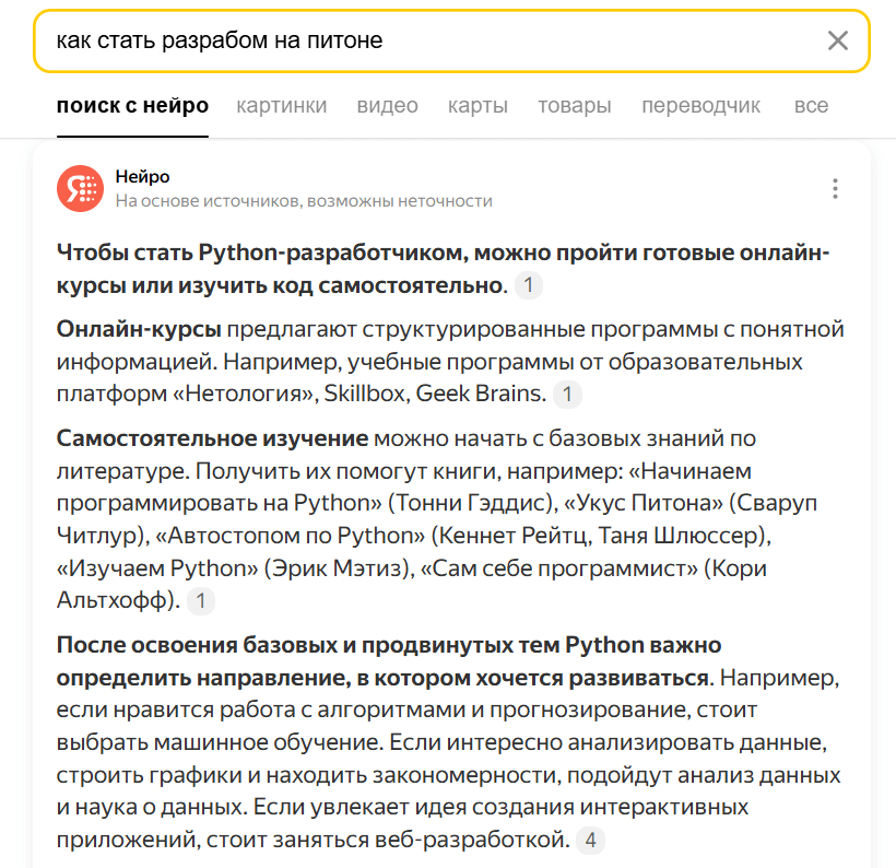Нейро — сервис внутри Яндекс Браузера и Поиска, который генерирует ответ на запрос пользователя. При запуске функции разработчики учили модель так, чтобы результаты были компетентными и подтвержденными, а также полезными и безопасными для пользователя.