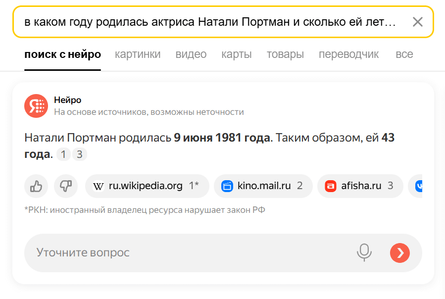 Уточнить деталь. Нейро под силу собрать информацию с нескольких сайтов, но ответы могут исказиться — если они были ошибочными или разными в первоисточниках. Поэтому сервисом стоит пользоваться с осторожностью, если нужно уточнить определенную дату или конкретный возраст.