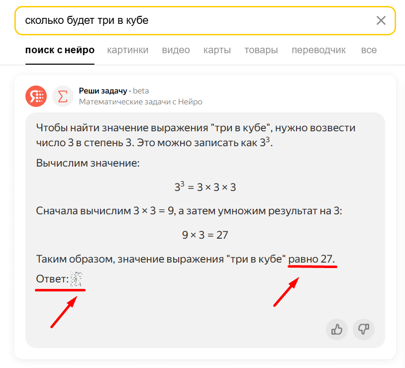 Ответ. Генерация с ссылками на источники. Прямой ответ на вопрос пользователя выделен полужирным, а поясняющий текст — обычным. Если вы хотите понять принцип работы инструмента и отображения ответа с технической точки зрения, читайте статью от Яндекса в блоге на Хабре.