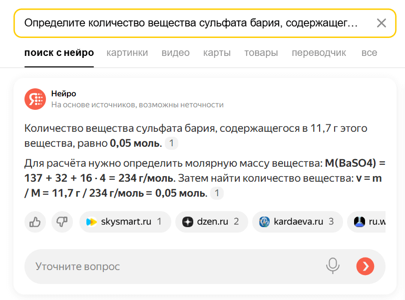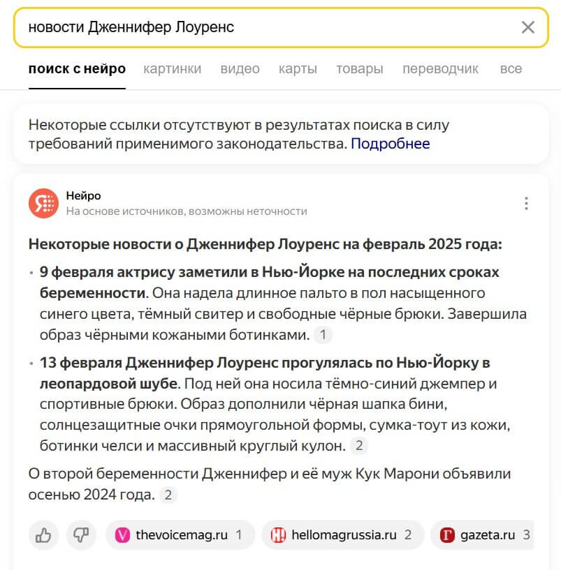 Хороший вариант — публиковать точечные статьи на узкие темы, чтобы пользователь увидел их в выдаче во время беседы с Нейро. Сравните сами: