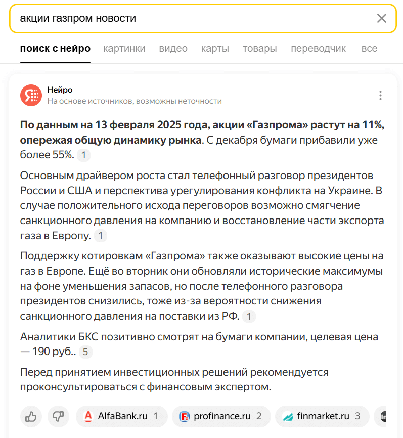 Я решила узнать, как выросли акции «Газпрома» — Нейро показывает на этот день 11%, но в других источниках цифра в 22%. Получается, что информацию все же нужно перепроверять. Как минимум, переходить по ссылкам из выдачи.