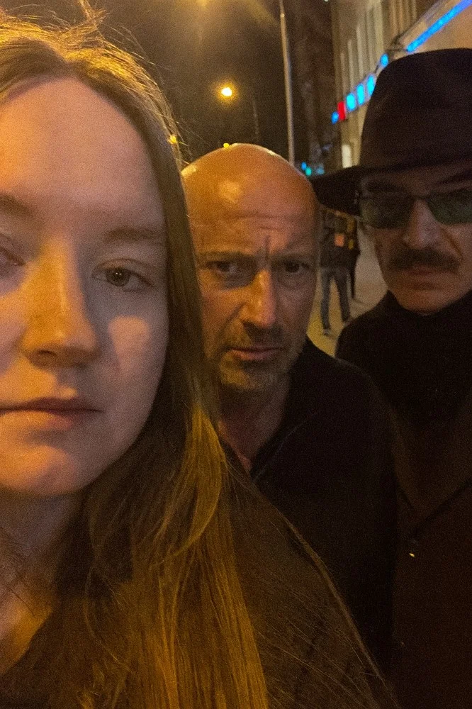 Сцена происходит возле концертной площадки: на фоне видны металлические ограждения, постеры и сценическое оборудование, но без толпы фанатов. Знаменитость все еще в концертном образе — заметная сценическая одежда с деталями вроде аксессуаров, блесток или многослойных тканей, намекающих на недавнее шоу. Человек с прикрепленного фото одет в повседневную одежду, на шее висит пропуск на ленте, который слегка качается от движения, тогда как у знаменитости пропуска нет. Освещение естественное и мягкое — теплый дневной свет с мягкими бликами и легкими отражениями от металлических поверхностей и близких стен. Кадр немного неровный: часть лиц может быть обрезана, фокус не идеально точный — это создает подлинное ощущение случайности, как у настоящего iPhone-снимка. Добавь легкое естественное зерно, мягкие тени и немного выцветший баланс цвета, чтобы передать реализм и теплую атмосферу настоящего дневного селфи, сделанного на улице после концерта. |